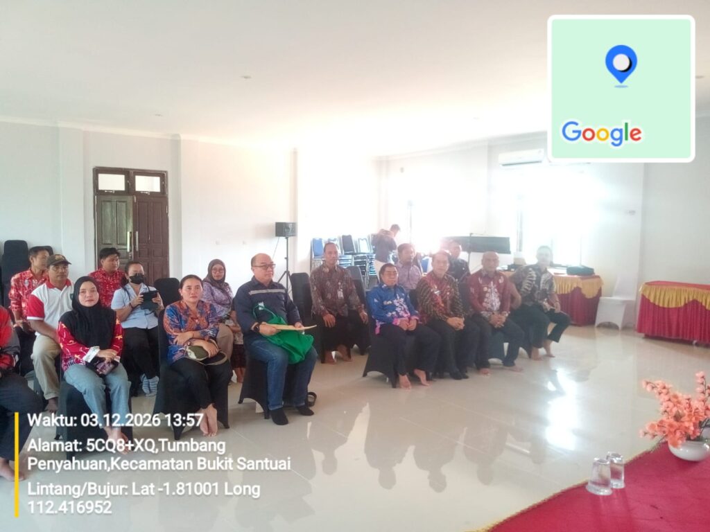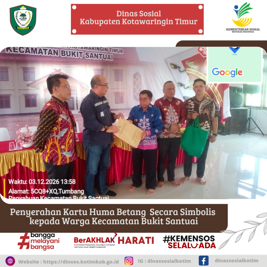 Kepala Dinas Sosial Kabupaten Kotawaringin Timur Hawianan, S.Sos dampingi perwakilan dari Dinas Energi dan Sumber Daya Mineral (ESDM) Provinsi Kalimantan Tengah dalam pelaksanakan kegiatan penyerahan simbolis Kartu Huma Betang kepada Kepala Desa Tumbang Penyahuan Sempung yang berlangsung dengan penuh khidmat dan dihadiri oleh Camat Bukit Santuai dan warga Desa Tumbang Penyahuan di Aula Desa Tumbang Penyahuan Kecamatan Bukit Santuai, Kamis (12/03/2026).